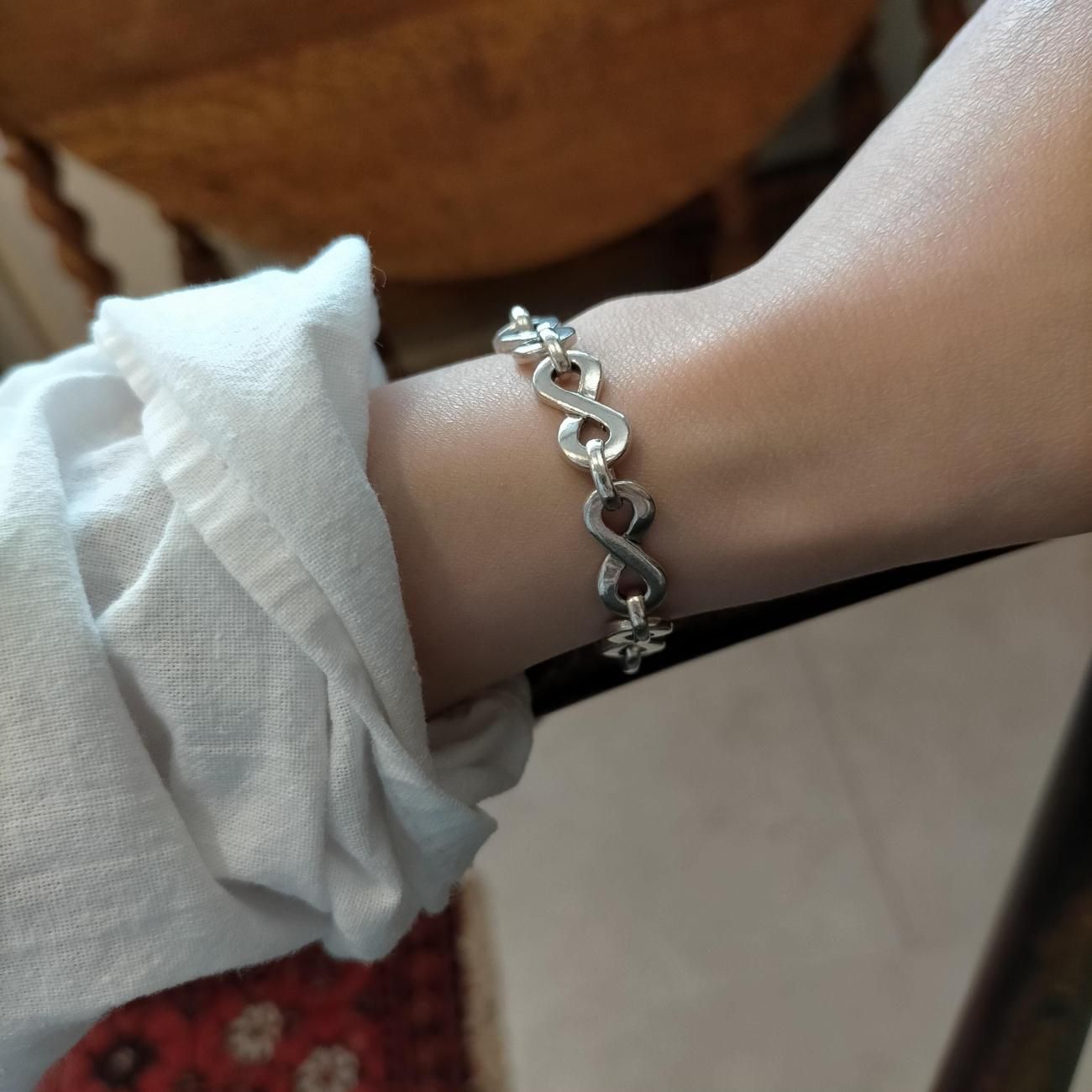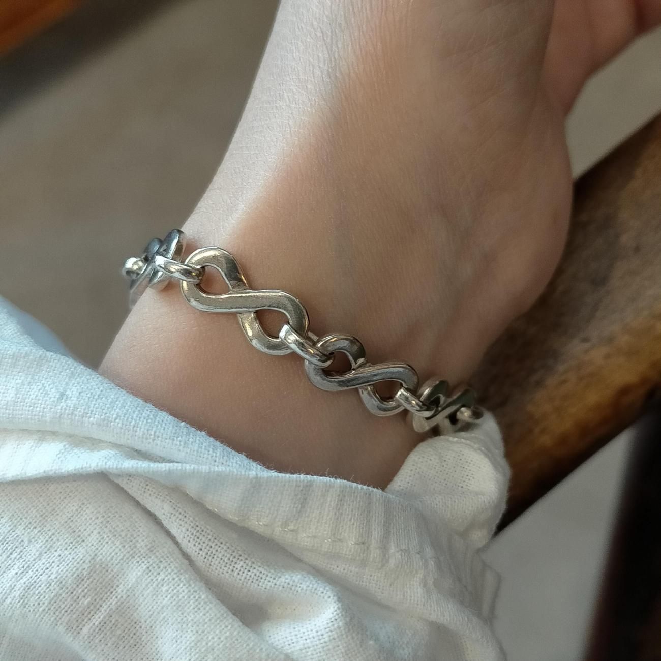 重厚感のあるシルバーの質感と、滑らかに交差するインフィニティのリンクデザインが特徴的な一点。