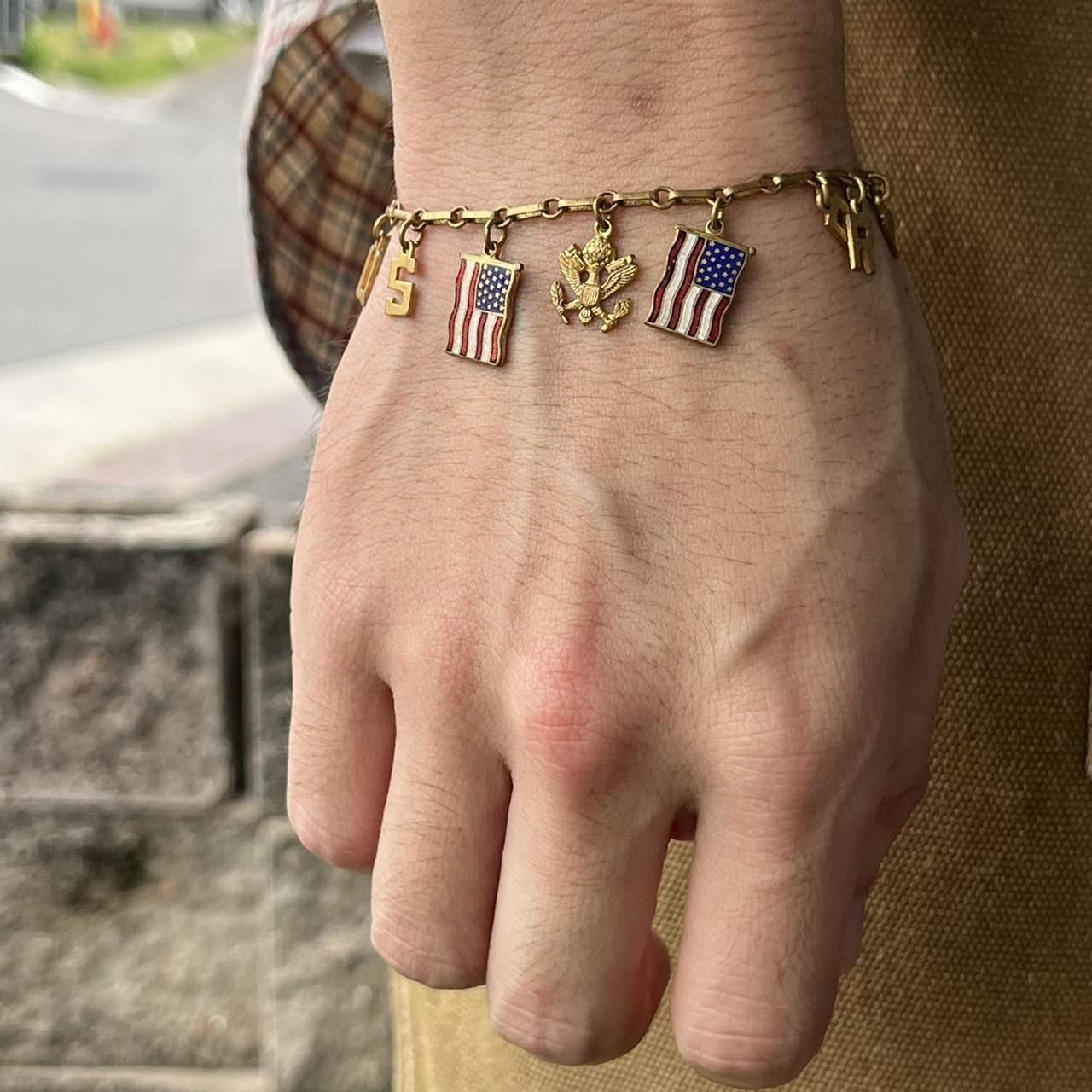 ゴールドトーンのチェーンに「U・S・A・R・M・Y」の文字チャーム、星条旗、そしてエナメル仕上げの白頭鷲モチーフがあしらわれています。
