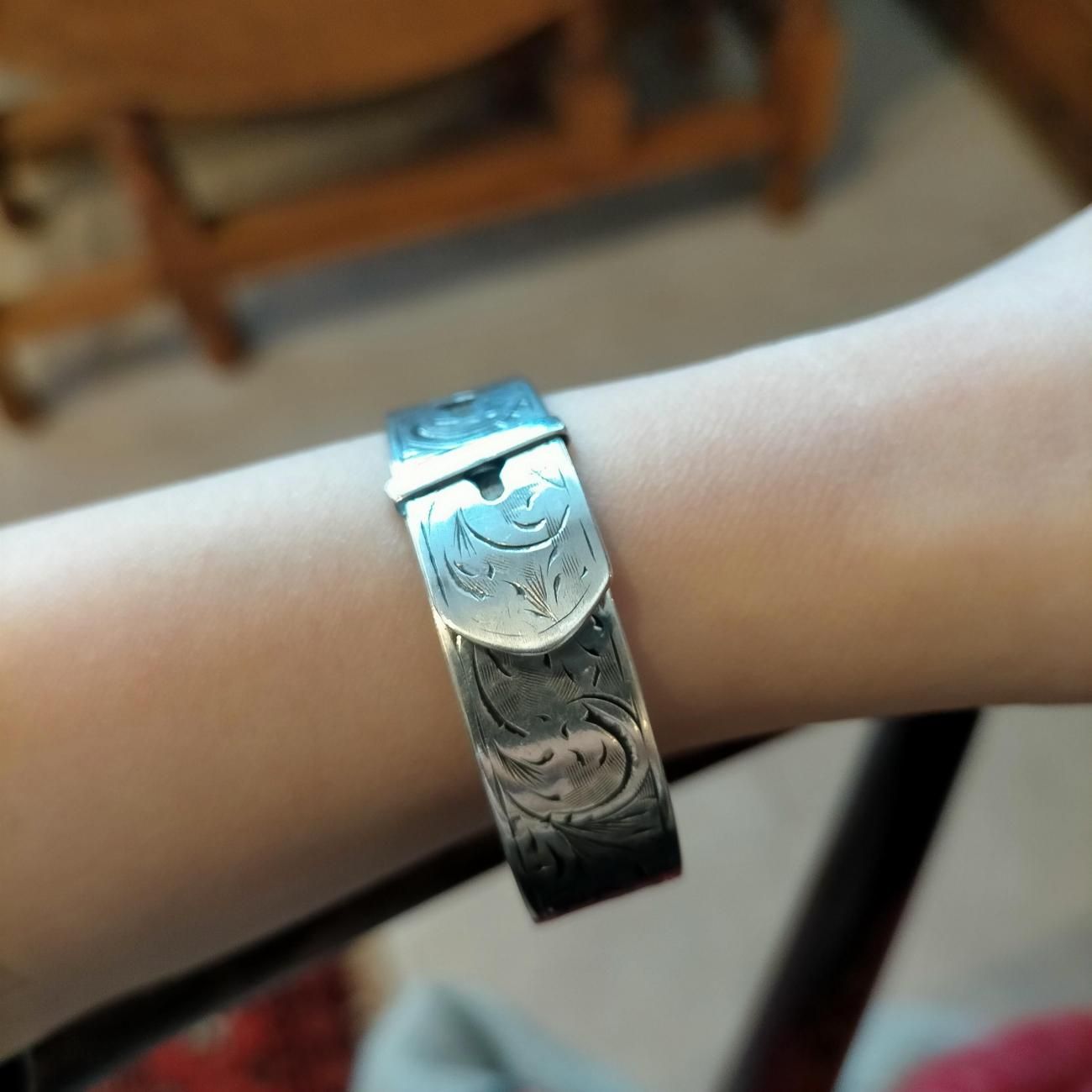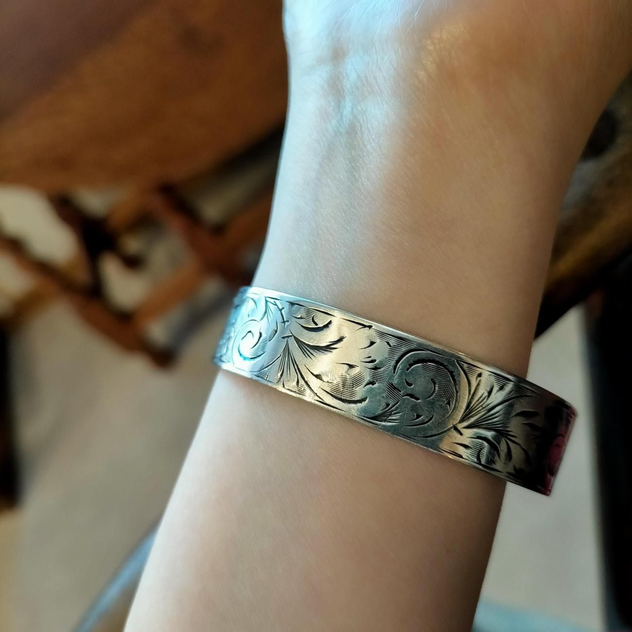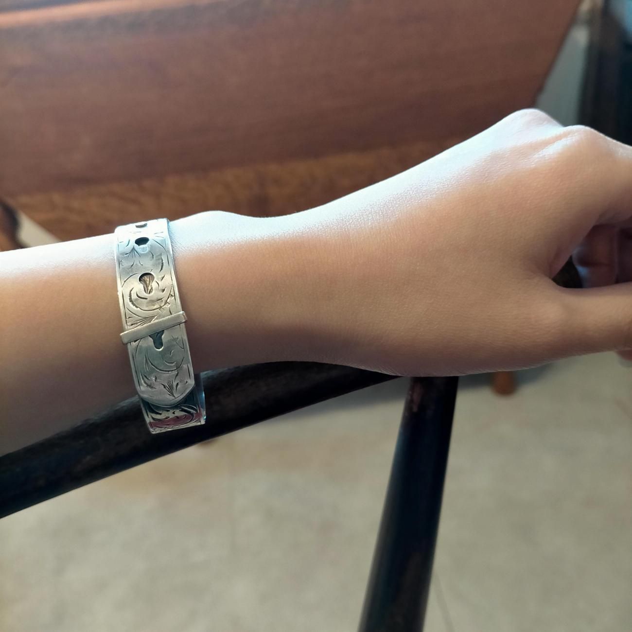 ホーム >ブレスレット >バングル ホーム > United Kingdomイギリス > ブレスレット 英国イギリス製1939年製ヴィンテージエングレービング彫刻スターリングシルバー製アジャスター式バックルカフブレスレット/バングル【15〜19cm】【N-27864】 商品説明 click! こちら英国イギリス1939年にチェスターで製造された、スターリングシルバー製のヴィンテージブレスレット/バングルになります。 アジャスター式になっており、留め具の穴4段階で調整可能です。 繊細な模様が彫られたアンティーク感溢れるデザイン。 男女問わずお使い頂け、着用すると大変雰囲気があり格好良いです。 *ホールマーク/刻印:C.H(工房)・ライオン(SILVER925)・チェスター(都市)・o(年号) *材質:スターリングシルバー *色:シルバー *重量:約14.3g *サイズ:幅12.6mm 厚さ2.7mm 腕周り(内周):約15〜19cm 【腕周り16.2cmのスタッフですと最小サイズから1つ大きくした位置で丁度です】 年代物になりますので経年による多少の擦れや小傷・シルバー特有の変色、着用に問題ない程度の僅かな歪みはありますが、全体的に綺麗で良好な状態です。 年月を重ねてきたヴィンテージならではのオールド感もあり雰囲気が素晴らしい逸品です。 ※年代物の風合いを損なわないため、変色は少し残しておりますが、もしご希望が御座いましたらもう少し綺麗に磨いてからお送りさせて頂くことも可能です。(施工費は無料) 年代物の大変貴重なコレクションです。 一期一会の一点物になりますのでこの機会に是非ご検討くださいませ。 大切な方への贈り物にもお勧めです。 プレゼント用ラッピングも承っておりますのでお気軽にご利用くださいませ。 販売価格 28,800円(内税) 購入数 名古屋市緑区大高町伊賀殿3-4 oldArt JR大高駅より徒歩6分(500m)、名鉄鳴海駅より徒歩12分(1km)駐車場(2台):店舗敷地内左から1つ目(小型車専用),2つ目(普通車)最寄りコインパーキング:名鉄協商大高東、名鉄協商大高東2(店舗まで400m) oldArtとは?Click ご注文一万円で送料無料にさせて頂きます。 Freemasonry Scandinavia Glasses Lady Watch Cameo Georg Jensen Claddagh Spoon Jewelry Mascot Doll SNS ツイート information contact この商品を友達に教える 買い物を続ける レビューを見る(0件) レビューを投稿